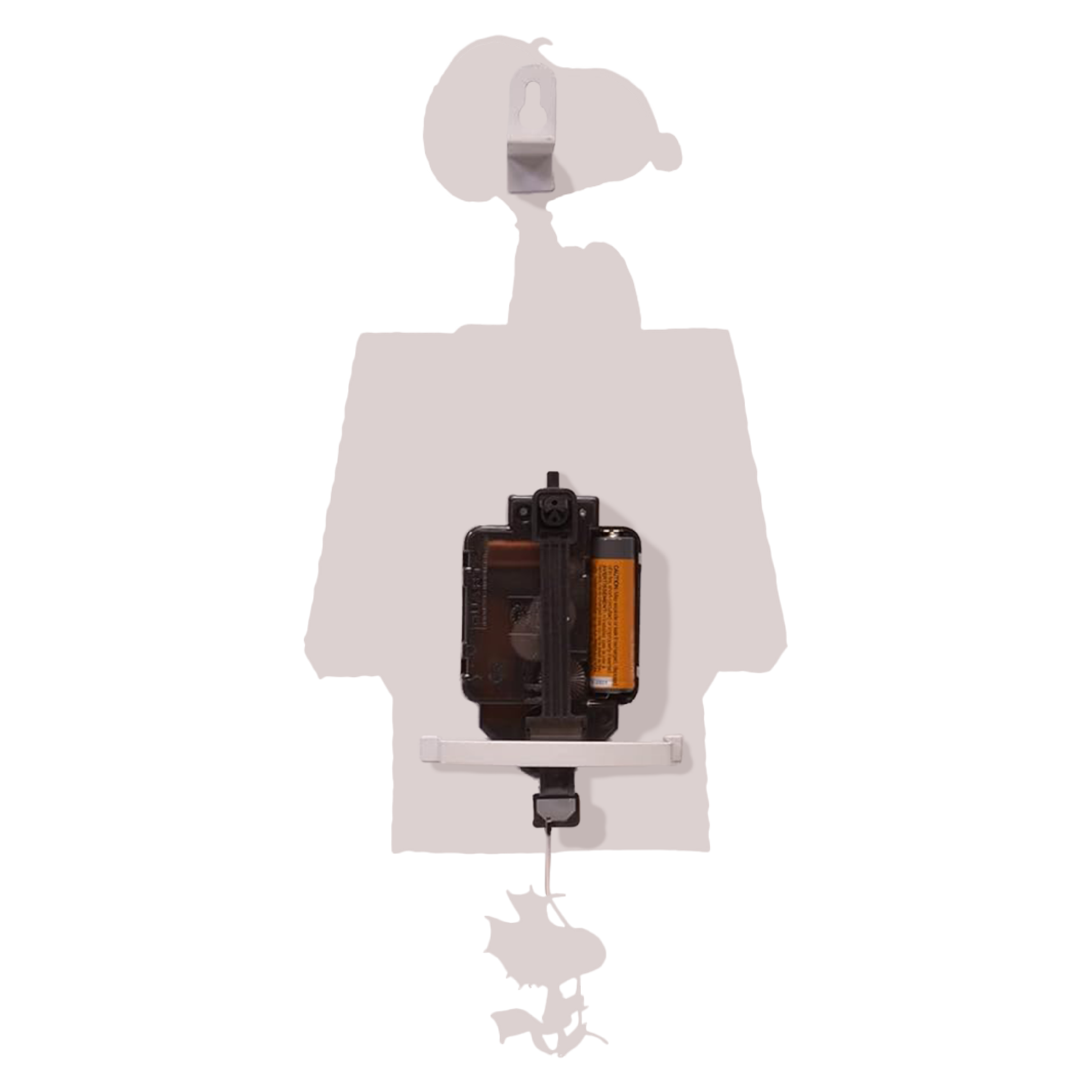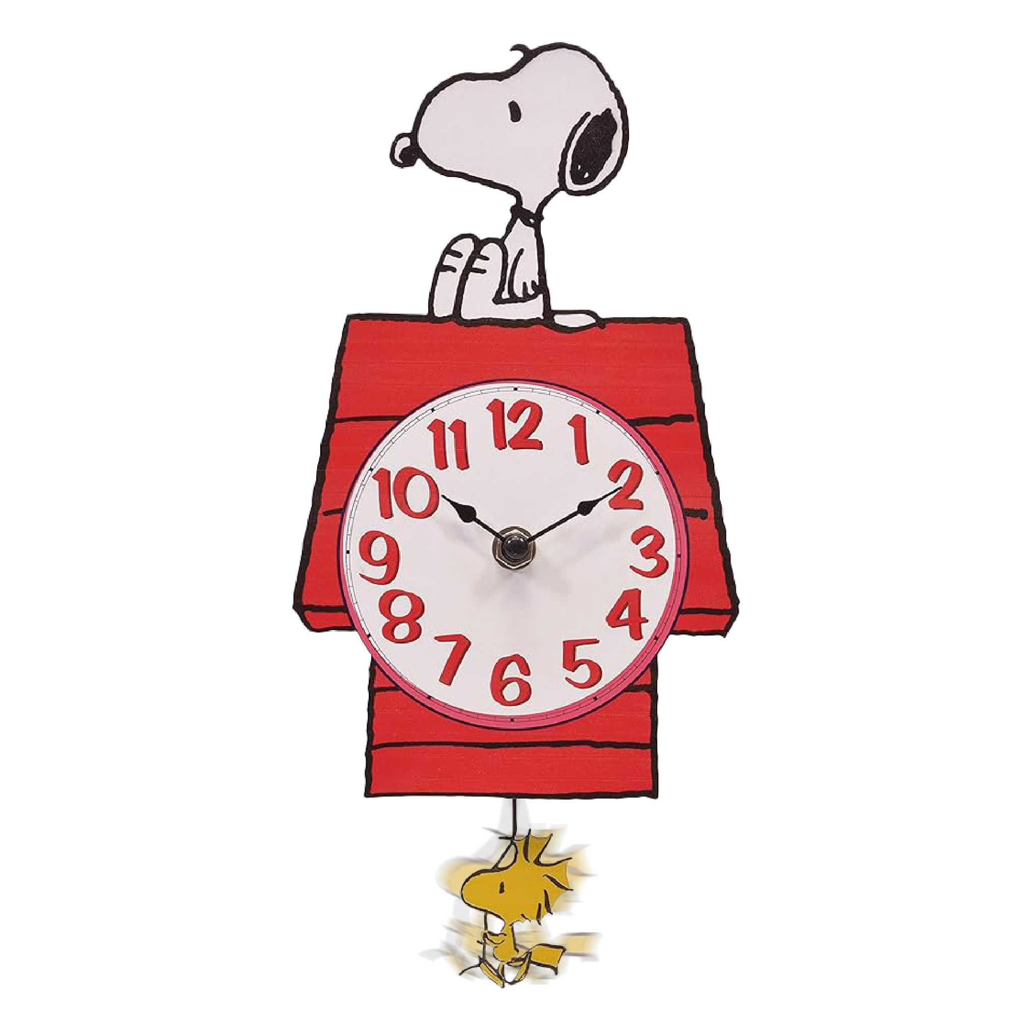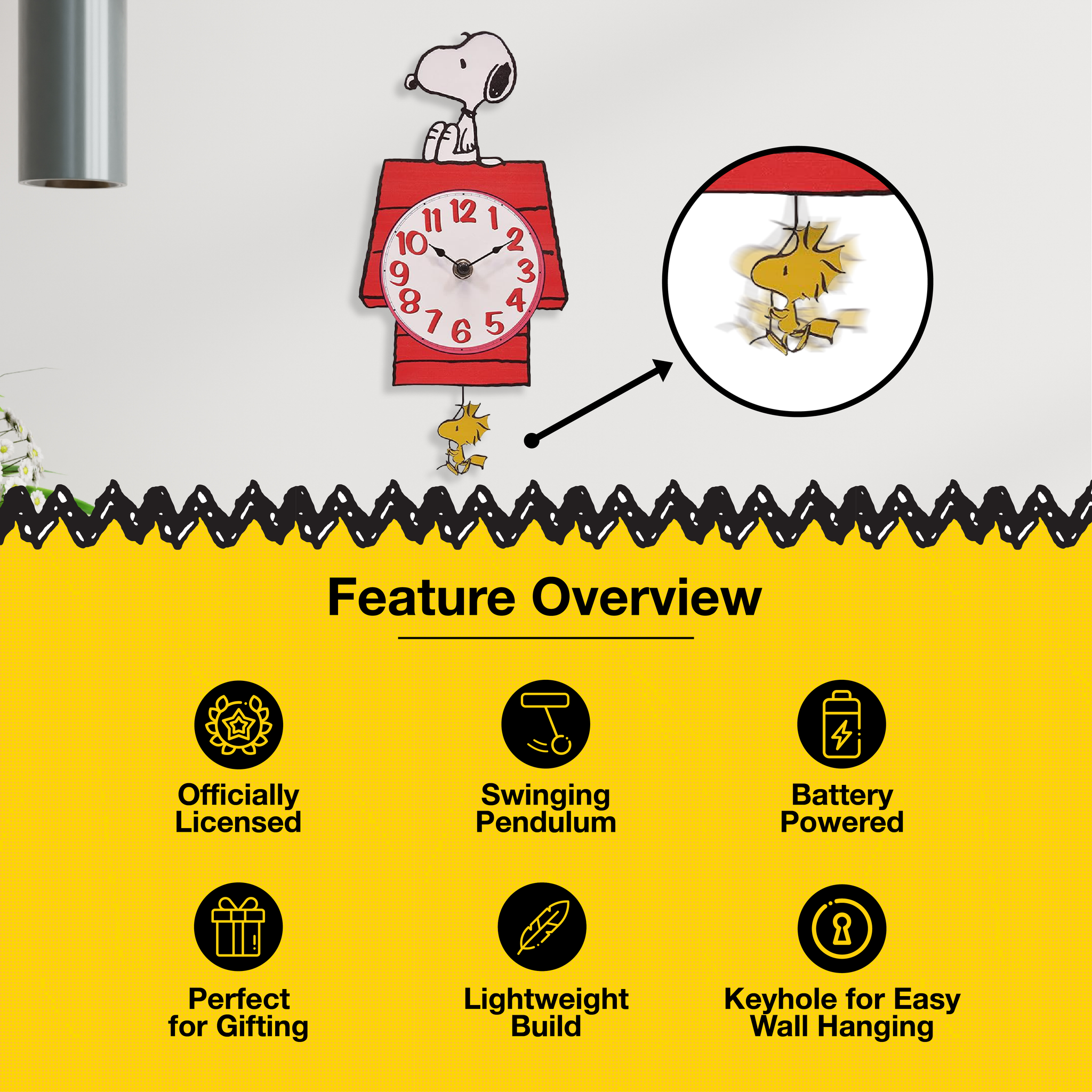 Officially Licensed Peanuts Collectible: Features Snoopy perched on his iconic red doghouse with Woodstock as a working pendulum.