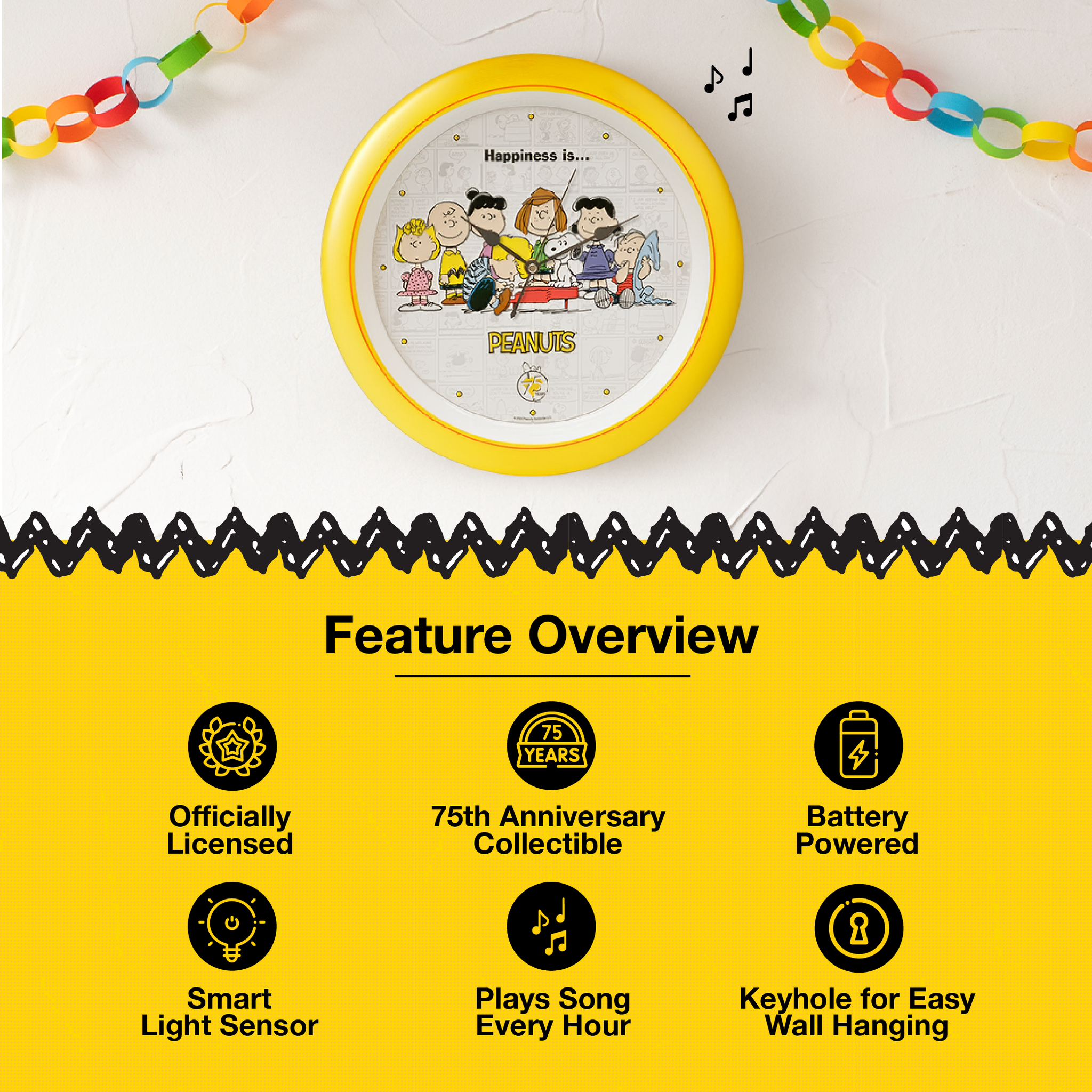 Officially Licensed Peanuts 75th Anniversary Collectible: Limited-edition clock celebrating 75 years of Peanuts, measuring 13 inches.